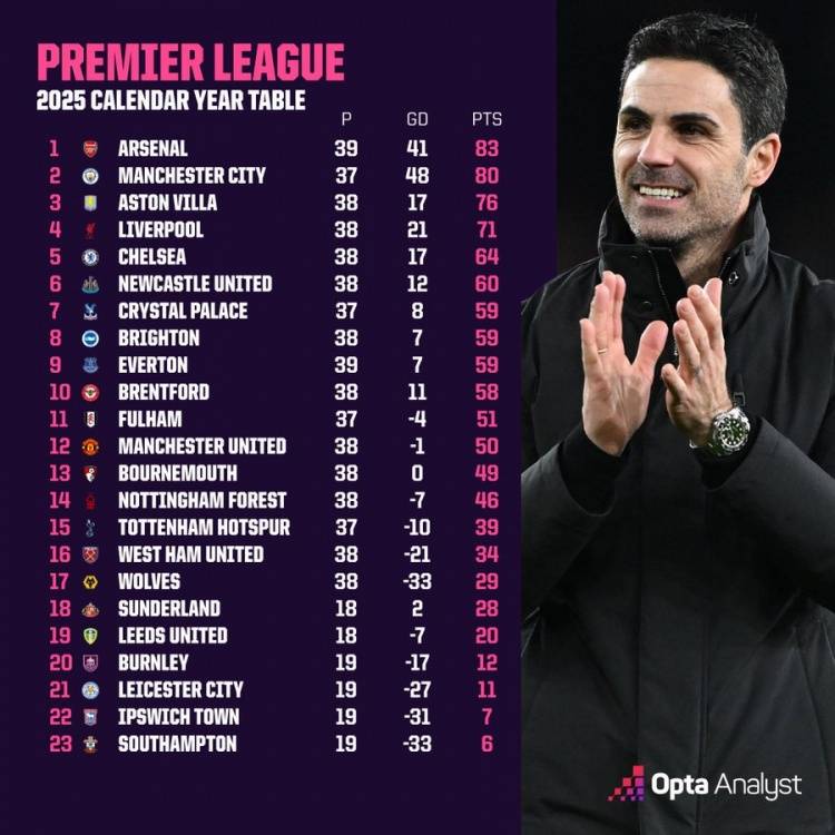 英超2025年度积分榜:阿森纳领跑曼城第2 曼联未进前十